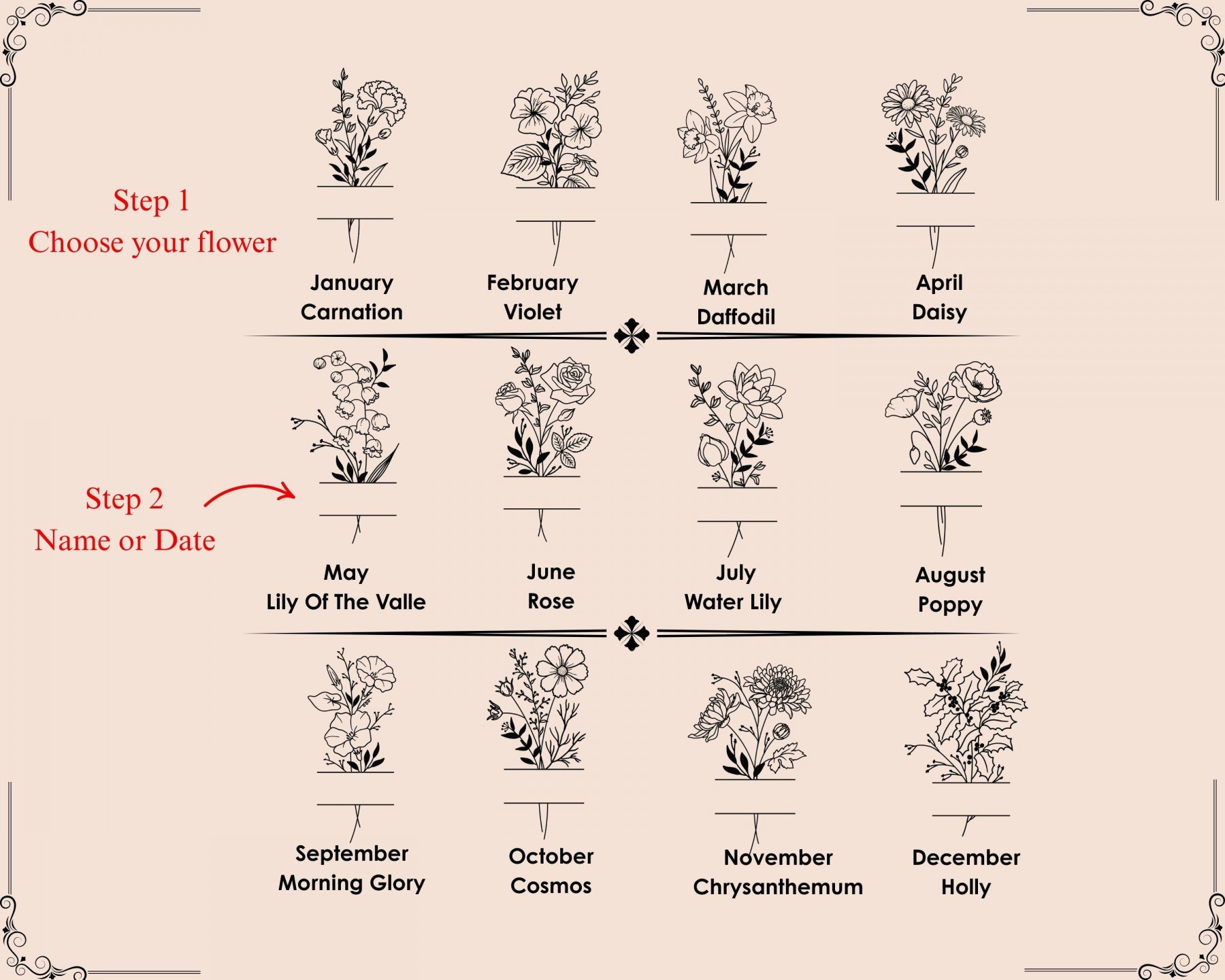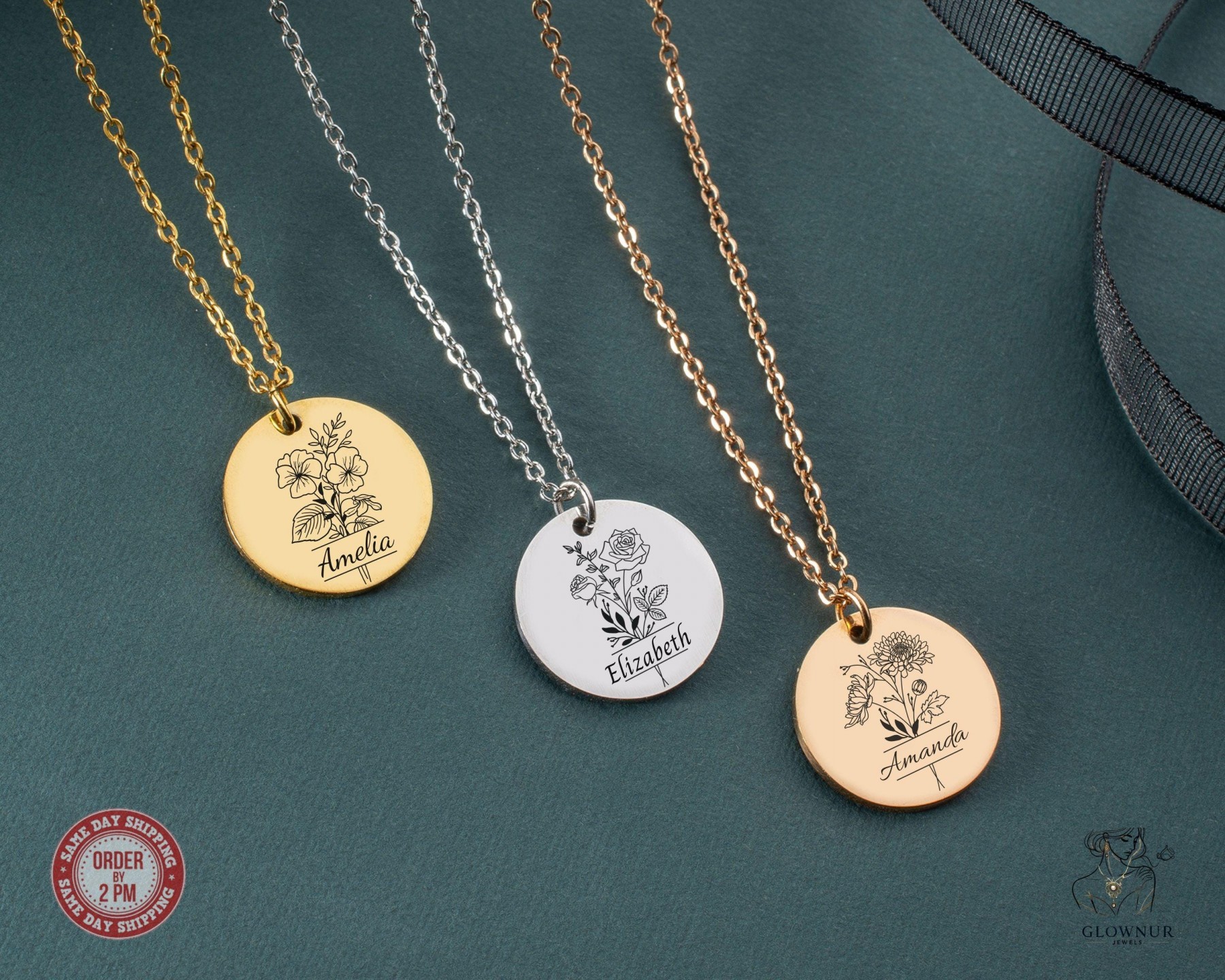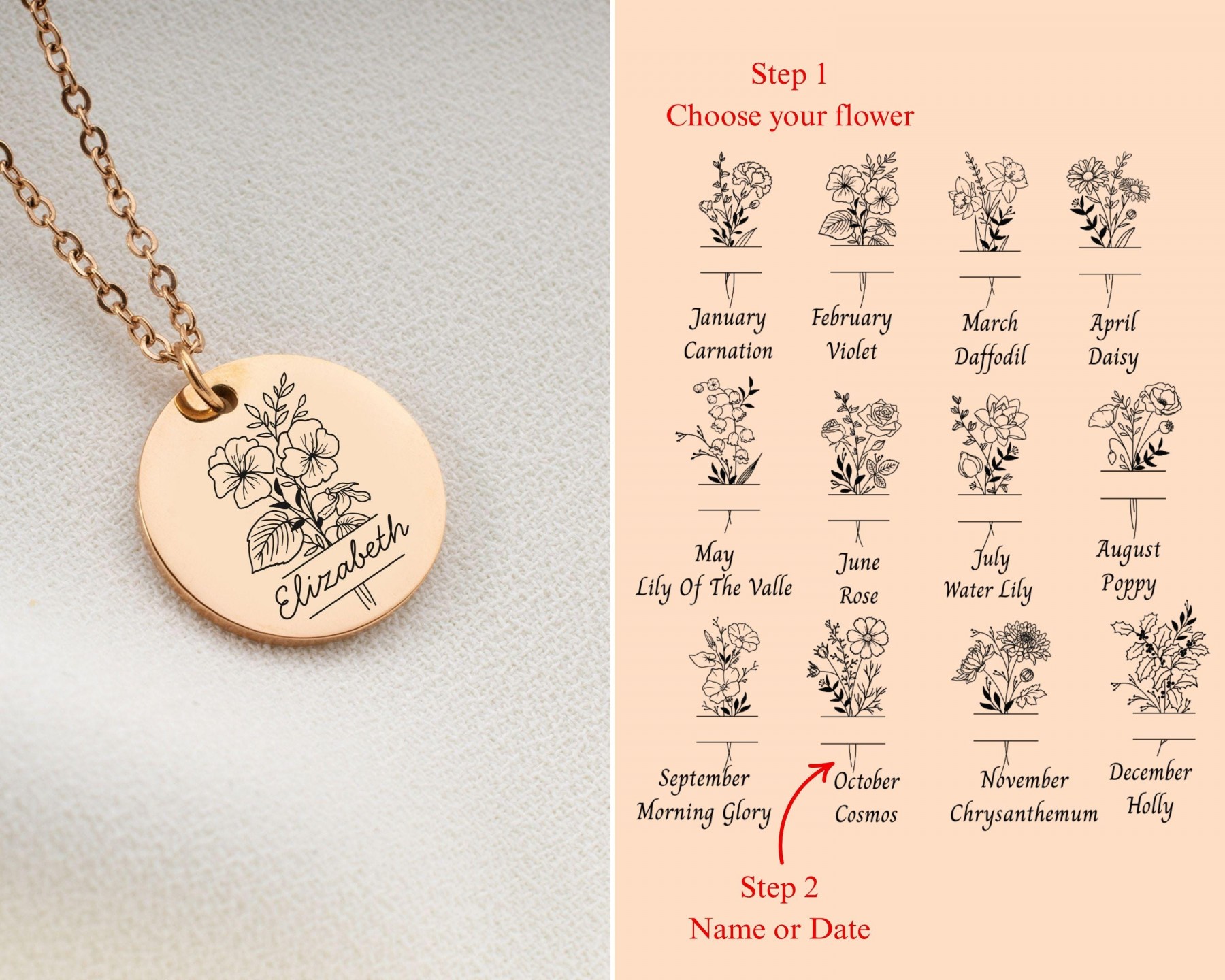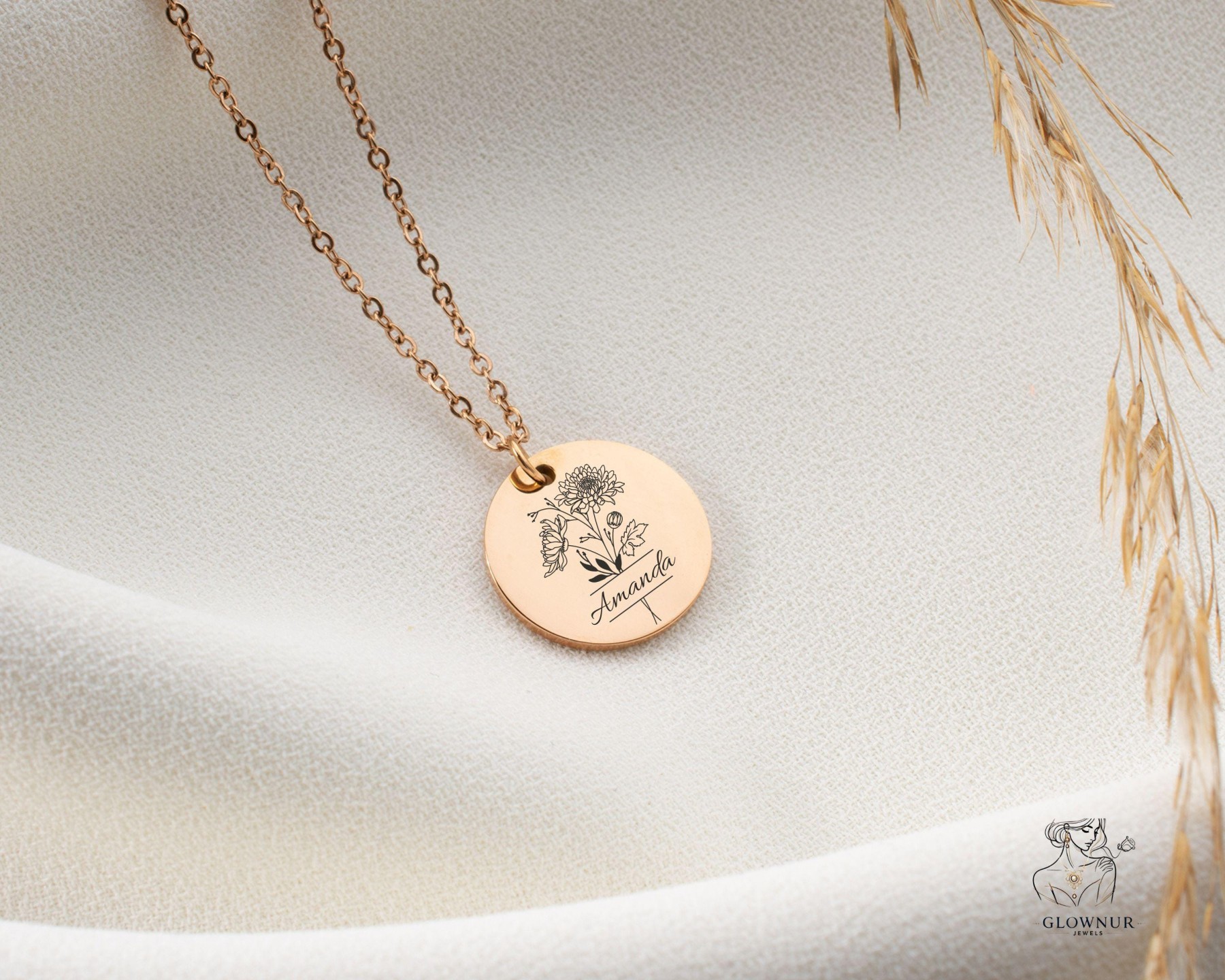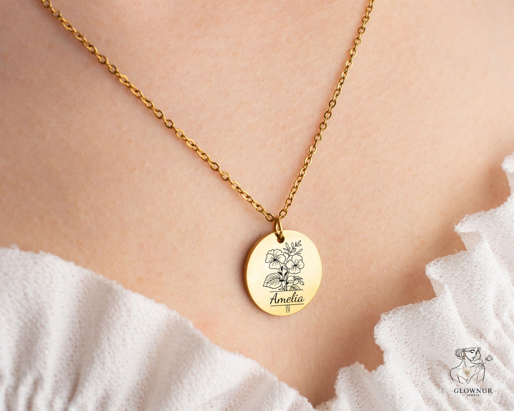 Custom Birth Flower Name Necklace | Personalized Disc Pendant | Minimalist Gold Jewelry Gift for Her, Mom, Bridesmaid