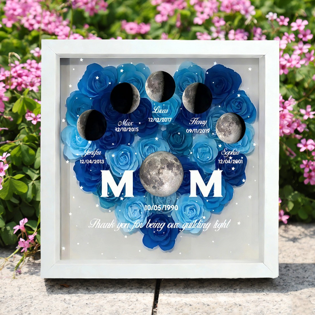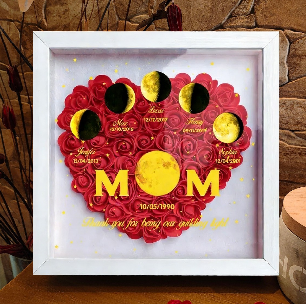 Custom Mom Moon Phase Shadow Box with Preserved Roses, Personalized Family Birth Date Flower Frame, Mother's Day Gift for Mom, Unique Keepsake for Grandma, Birthday Gift for Her