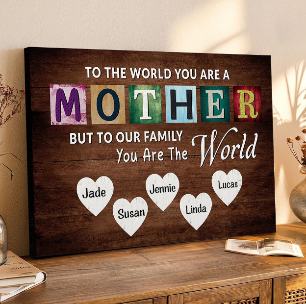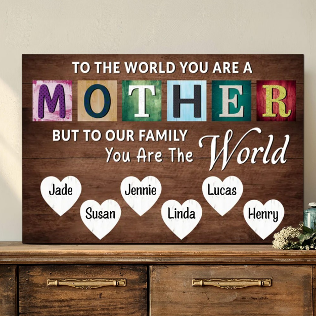 Custom Mother's Day Wall Art, Personalized Mom Sign with Kids Names, To The World You Are A Mother But To Our Family You Are The World, Mother's Day Gift for Mom, Customized Wooden Canvas Print for Home Decor
