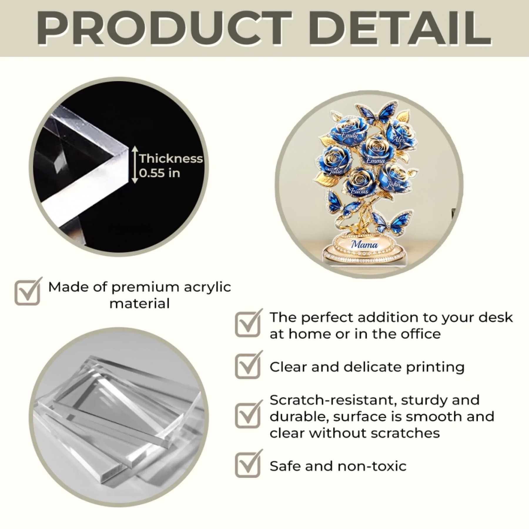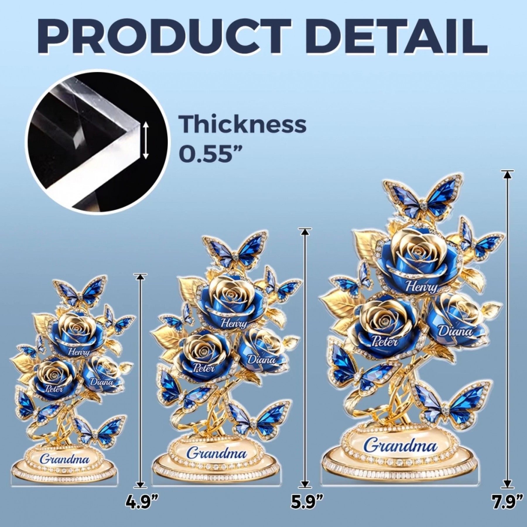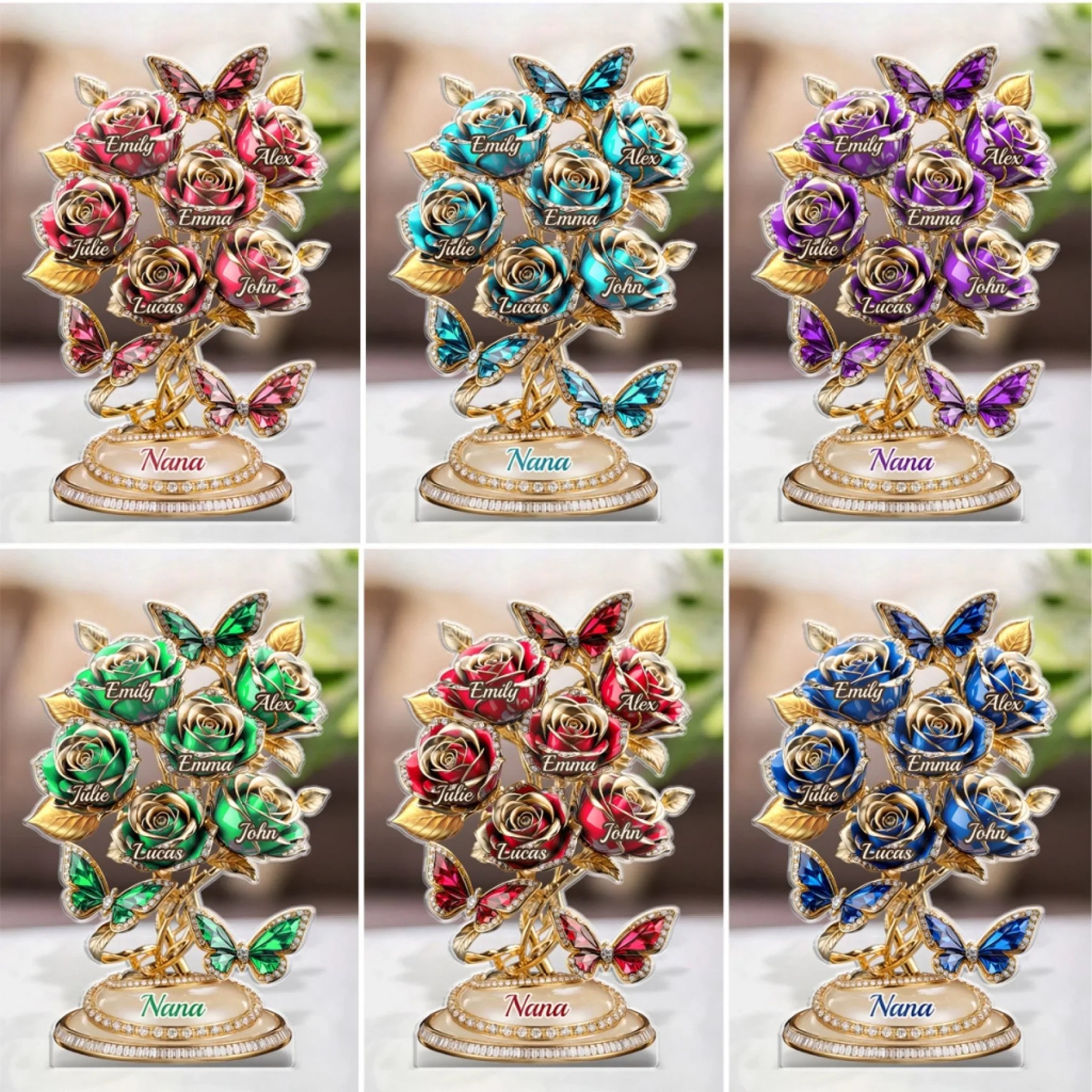 Personalized Family Tree Rose Acrylic Plaque - Custom Mom Gift with Kids Names, Blue Gold Butterfly Decor for Mother's Day, Birthday