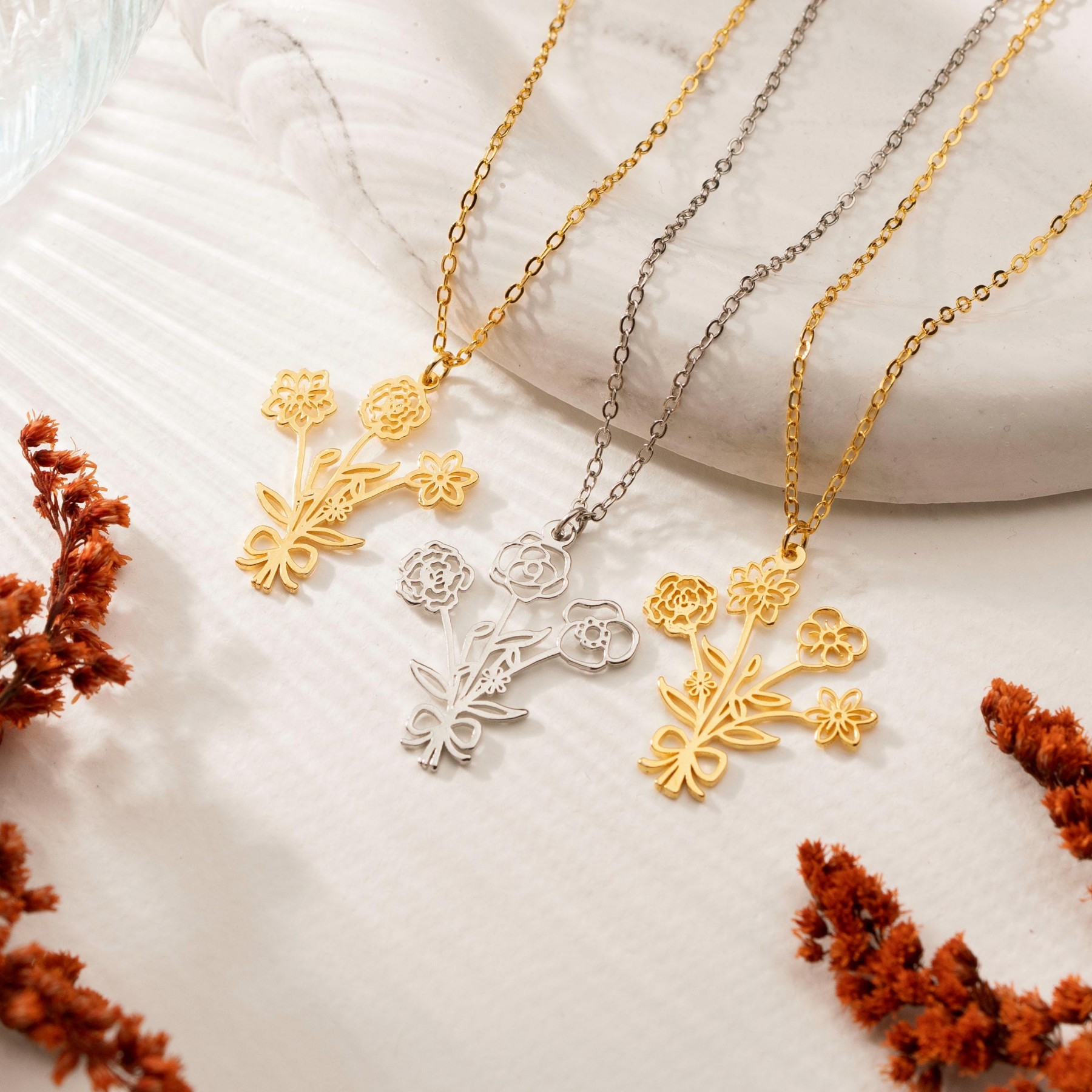 Stainless Steel Flower Bouquet Necklace for Women – Minimalist Floral Pendant Necklace in Gold/Silver Tone, Dainty Birth Month Flower Jewelry Gift for Her, Mom, Friend