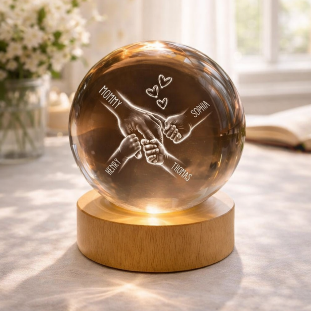 Personalized Family Hands 3D Crystal Ball Lamp, Custom 1-5 Names Engraved Night Light, Warm LED Wooden Base Table Lamp, Unique Birthday Mothers Day Christmas Gift for Mom Dad Wife Husband New Parents