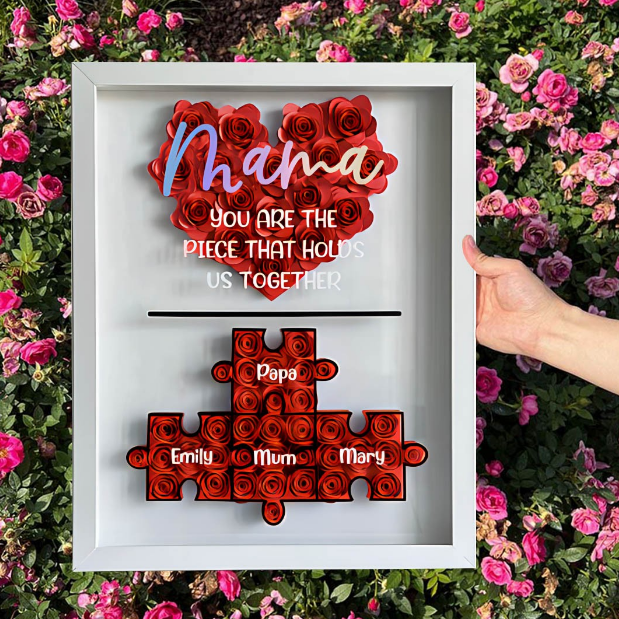 Personalized Family Name Puzzle Rose Shadow Box, Custom 3D Flower Frame with Heart & Names, Mother's Day Gift for Mom Nana Grandma, Unique Home Decor for Living Room Bedroom
