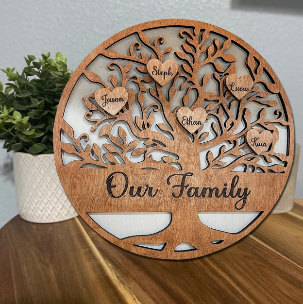 Personalized Family Tree Wood Sign - Custom Names Heart Wall Art - Rustic Laser Cut Wooden Family Tree Plaque for Home Decor, Housewarming Gift