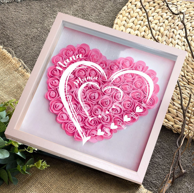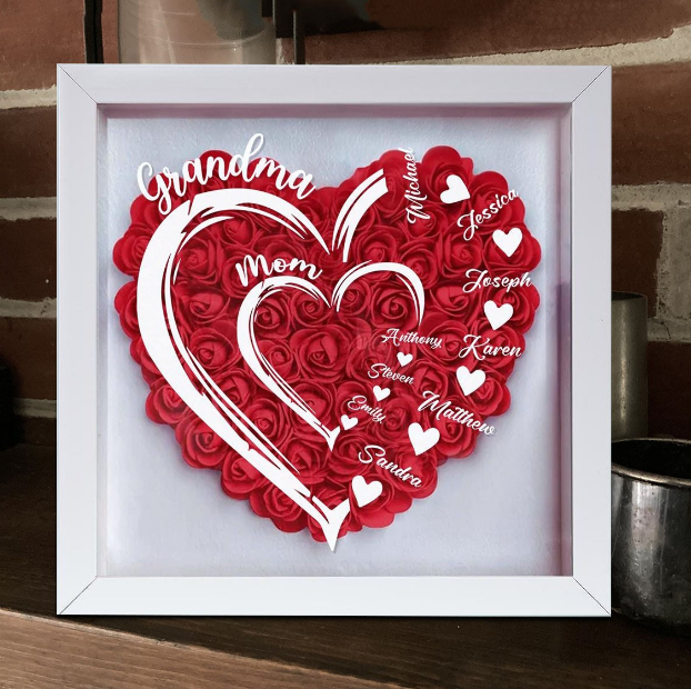 Personalized Grandma Mom Shadow Box, Custom Name 3D Paper Rose Heart Frame with Grandkids Names, Handmade Mother's Day Birthday Gift for Grandma, Nana, Mimi, Family Wall Decor