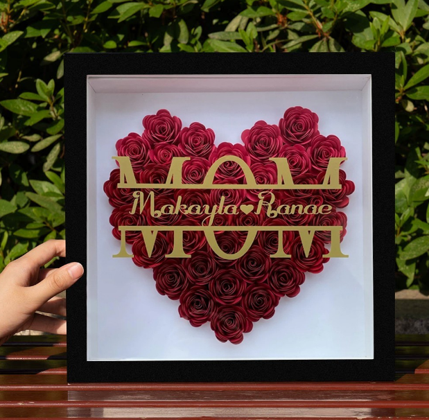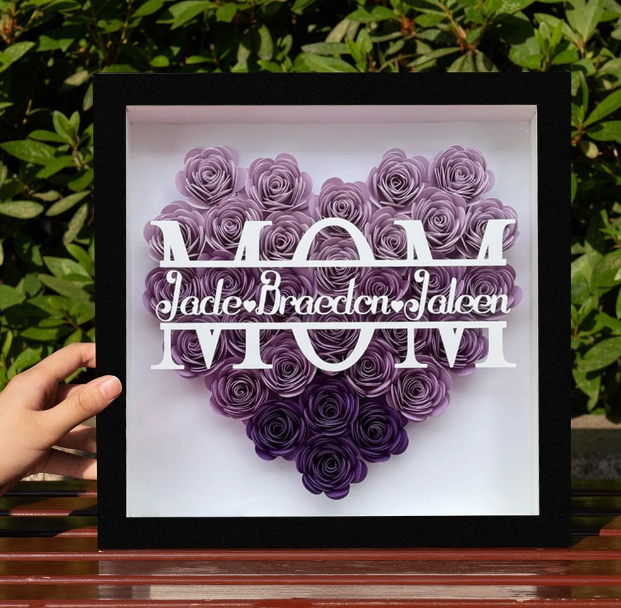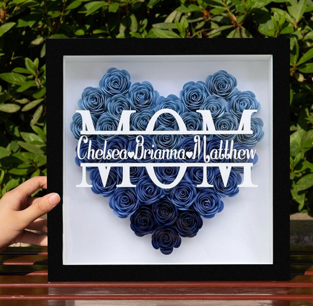 Personalized Mom Flower Shadow Box with Kids Names, Custom 3D Paper Rose Heart Frame, Mother's Day Birthday Gift for Mom Grandma, Handmade Keepsake Wall Art Decor