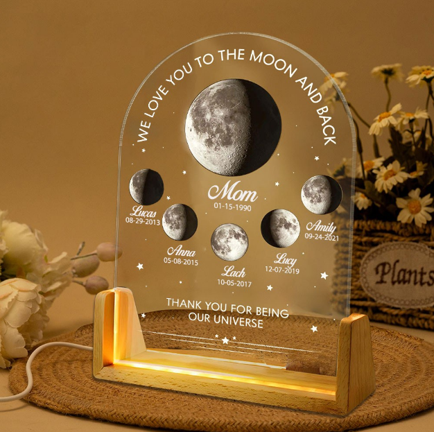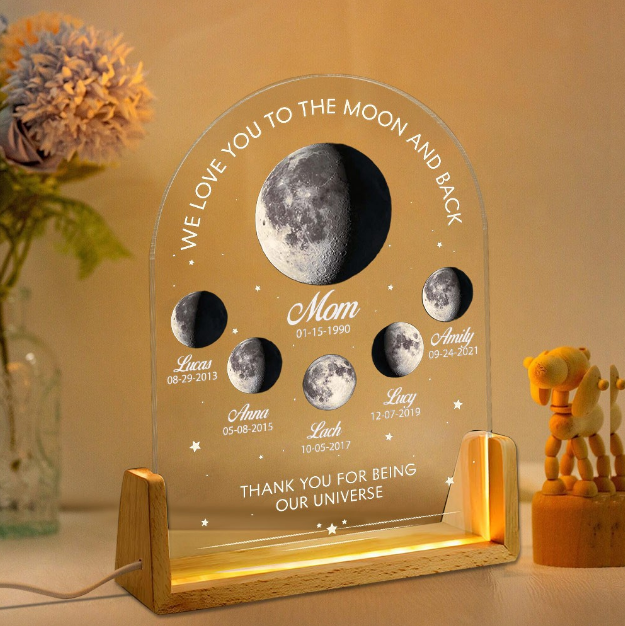 Personalized Moon Phase Night Light for Mom - Custom Family Names & Birthdates Acrylic Lamp - Mother's Day Gift from Kids - "We Love You to the Moon and Back